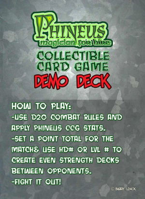 Phineus Collectable Card Game These are the cards for the Collectible Card game I have available at shows and maybe soon, online. It uses the open D20 system. Share this: Click to share on Facebook (Opens in new window) Facebook Click to share on LinkedIn (Opens in new window) LinkedIn Click to share on Reddit (Opens in new window) Reddit Click to share on Tumblr (Opens in new window) Tumblr Click to share on Pinterest (Opens in new window) Pinterest Click to share on WhatsApp (Opens in new window) WhatsApp Click to share on Mastodon (Opens in new window) Mastodon Click to share on Threads (Opens in new window) Threads Click to share on Bluesky (Opens in new window) Bluesky Like Loading...