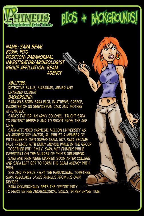 Noeland Collins has done 2 stories focused around her, Sara One Shot (with Marshall Dillon) & The Werewolf Conundrum. In Jason Bender’s Have A Drink on Me, Sara is the hero, saving Phineus from The Contessa and himself.