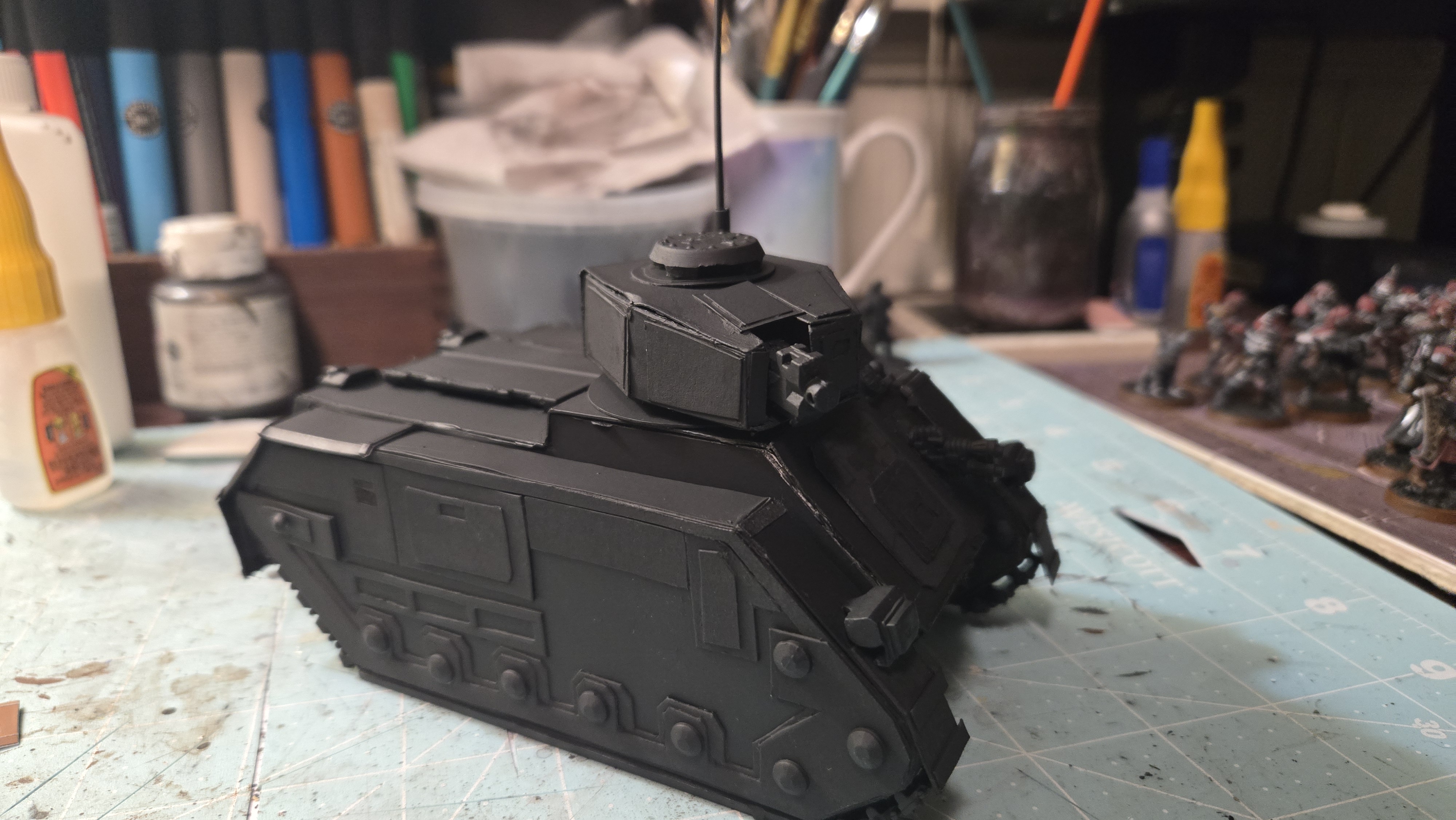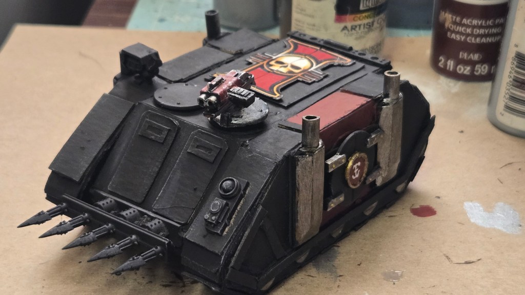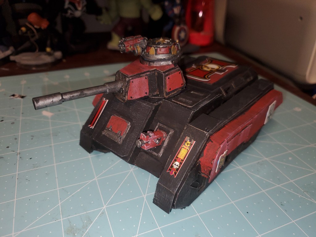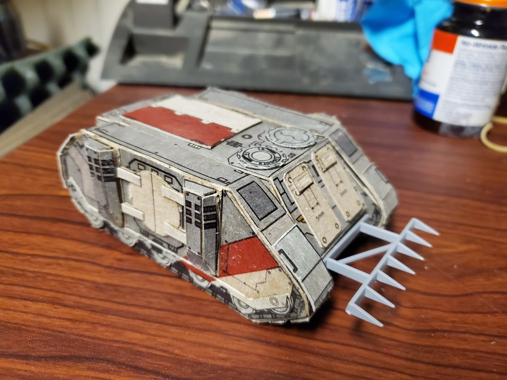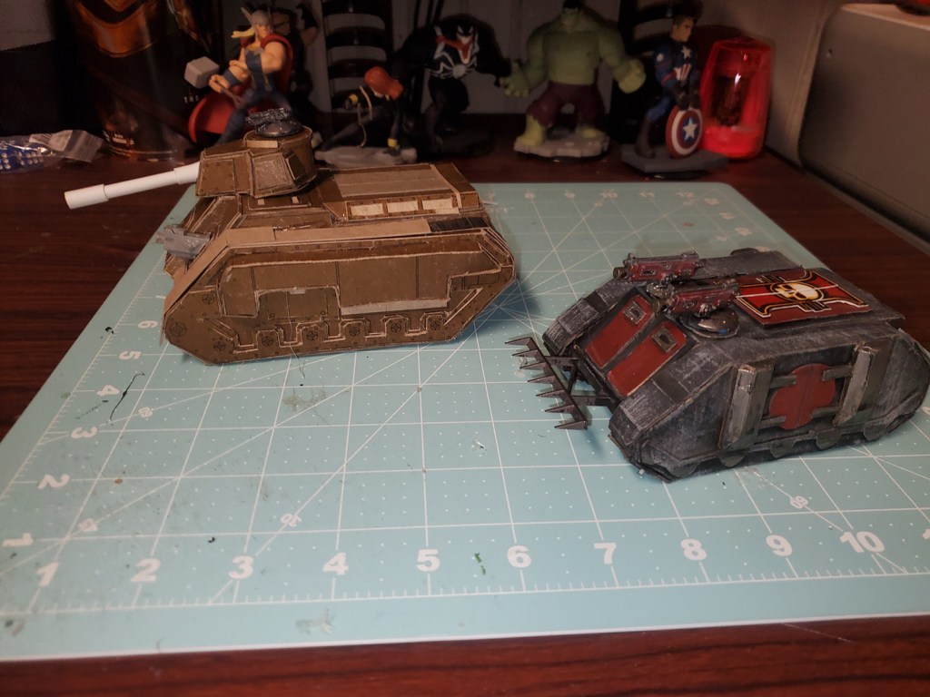 I love the Inquisition in Warhammer 40k. I have several warbands of them in my collection. As they ally with my many armies, I need specialized transports for them. I already showed you my paperhammer rhino, so here is my paperhammer Chimera. (rhino shown for scale & upgrades I did on it)