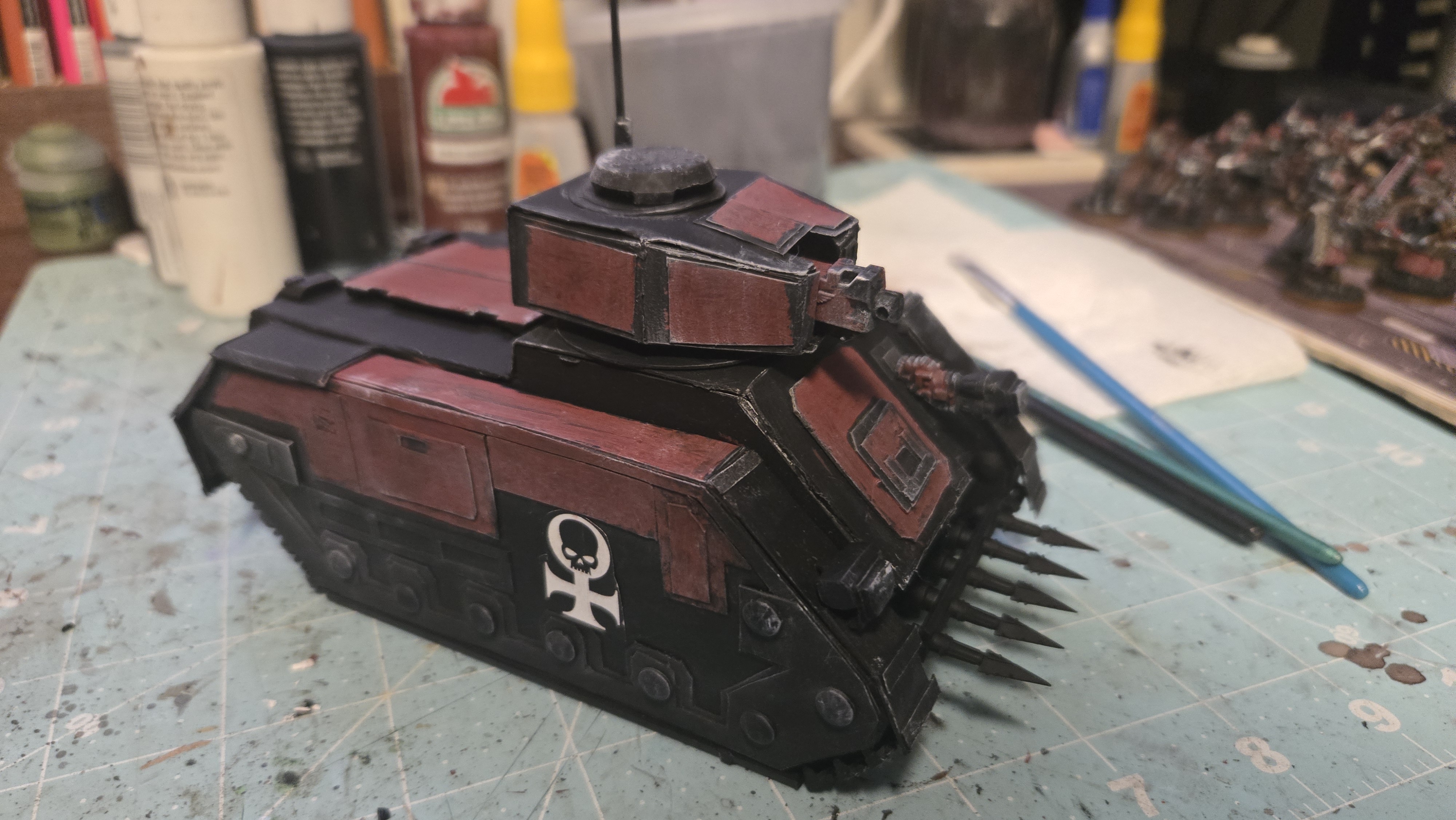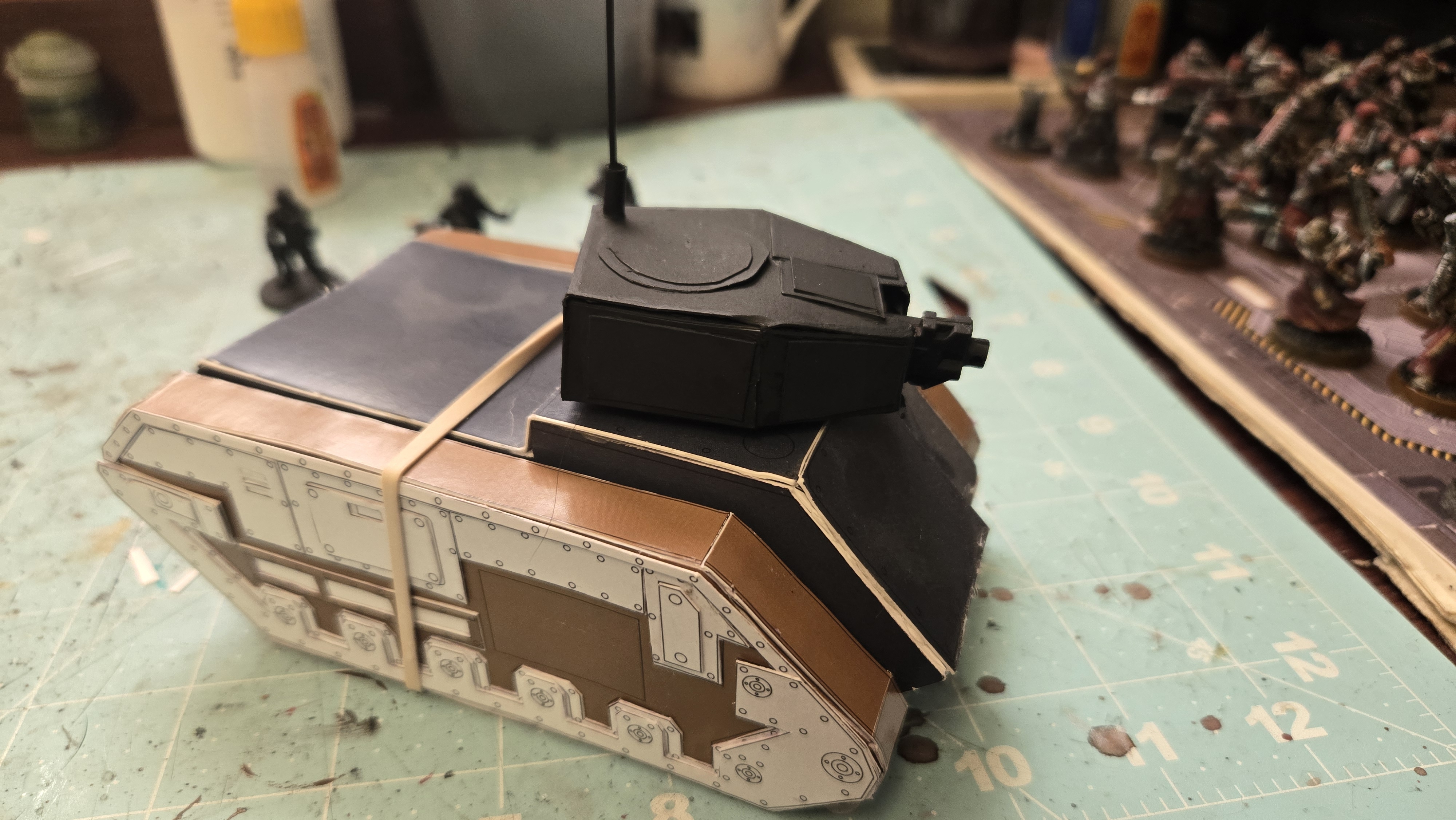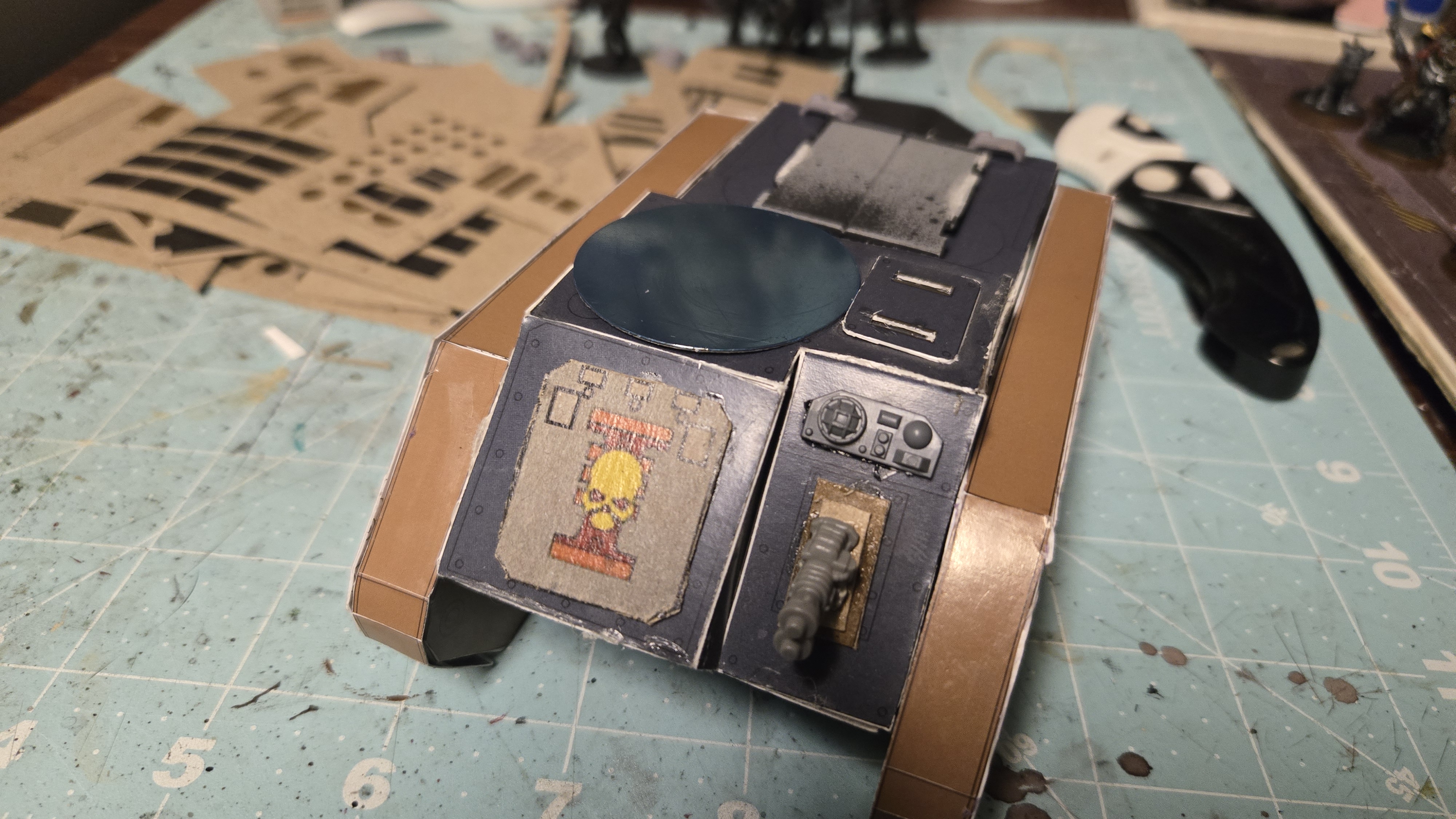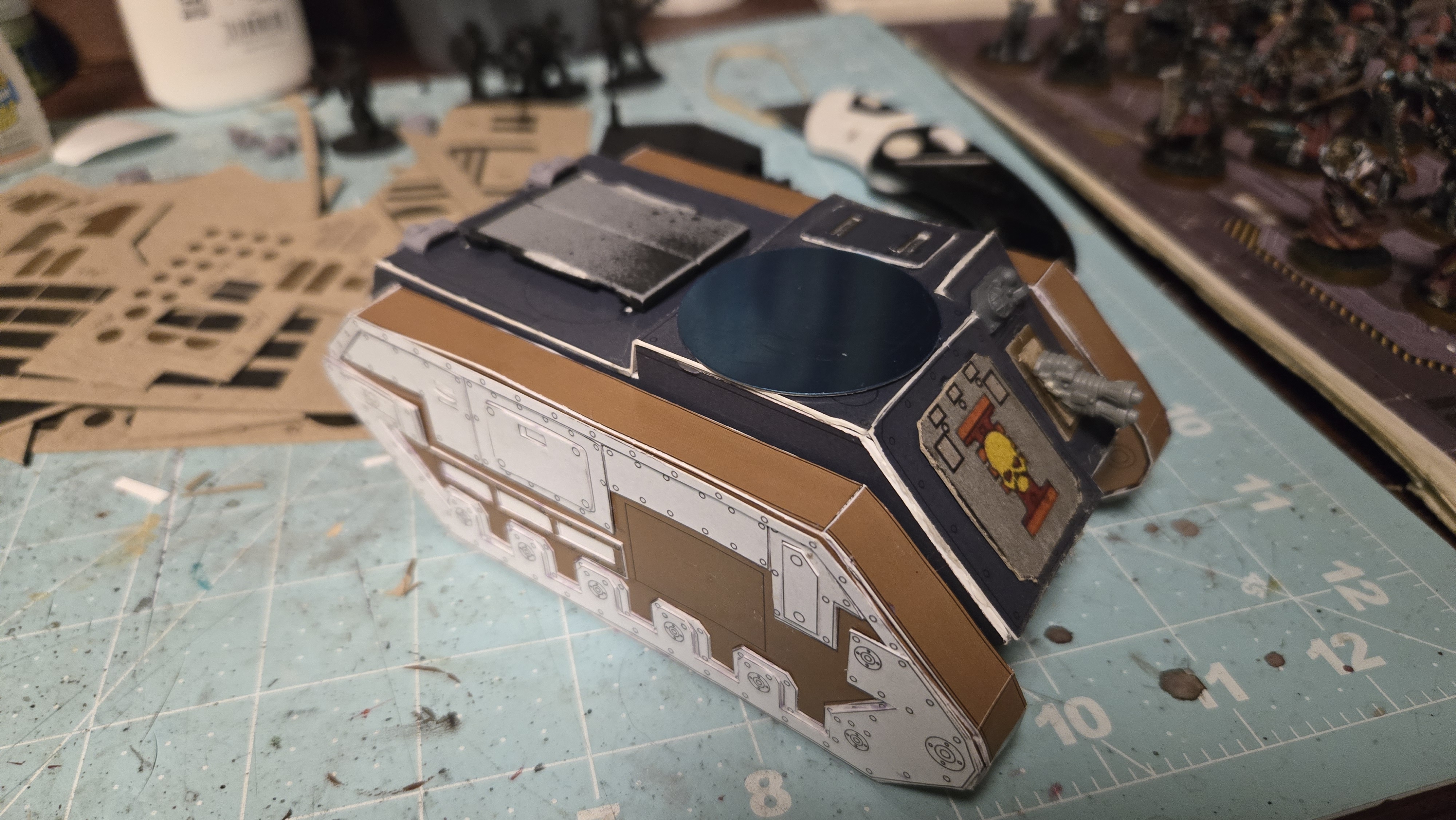 I love the Inquisition in Warhammer 40k. I have several warbands of them in my collection. As they ally with my many armies, I need specialized transports for them. I already showed you my paperhammer rhino, so here is my paperhammer Chimera. (rhino shown for scale & upgrades I did on it)