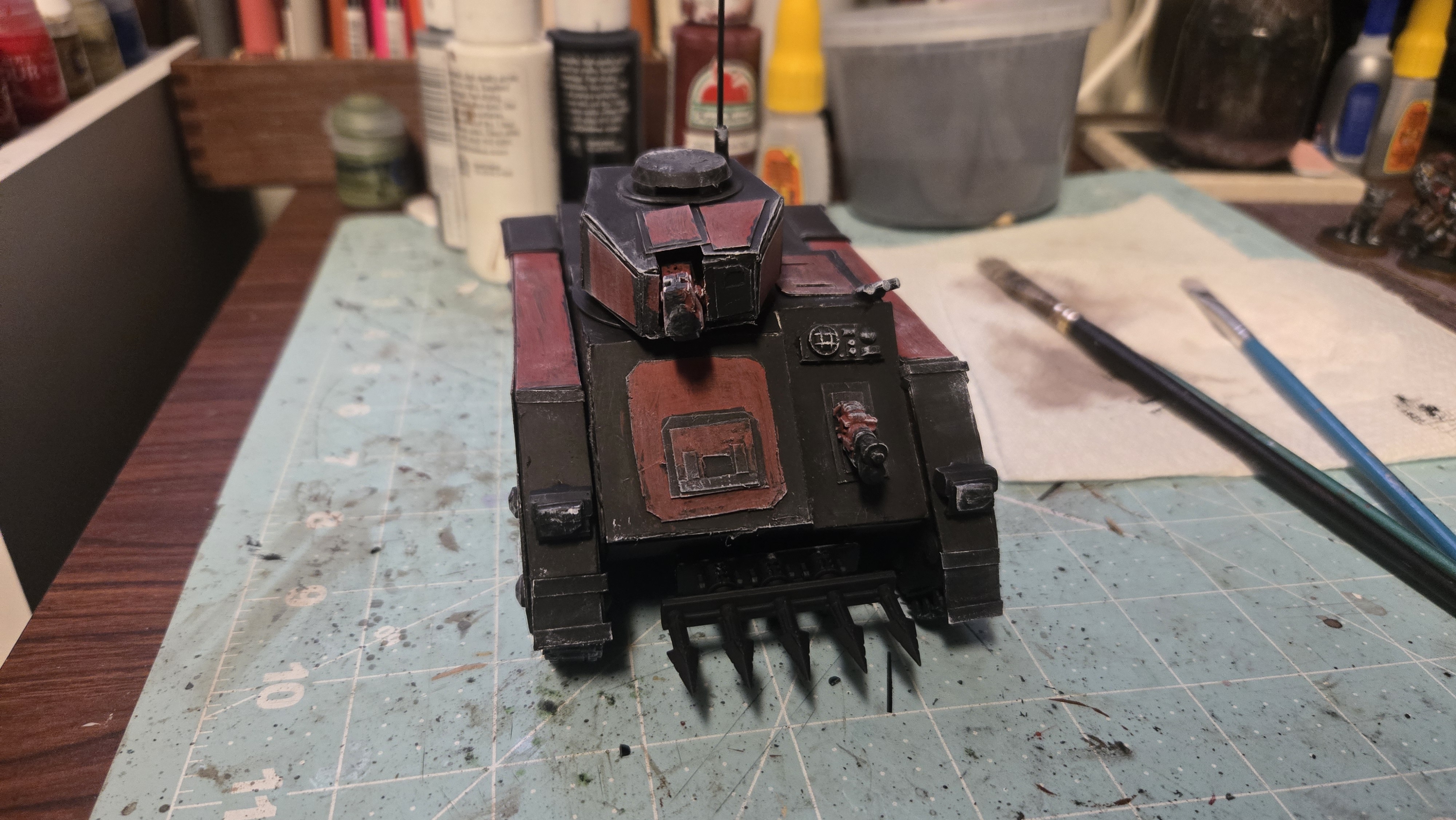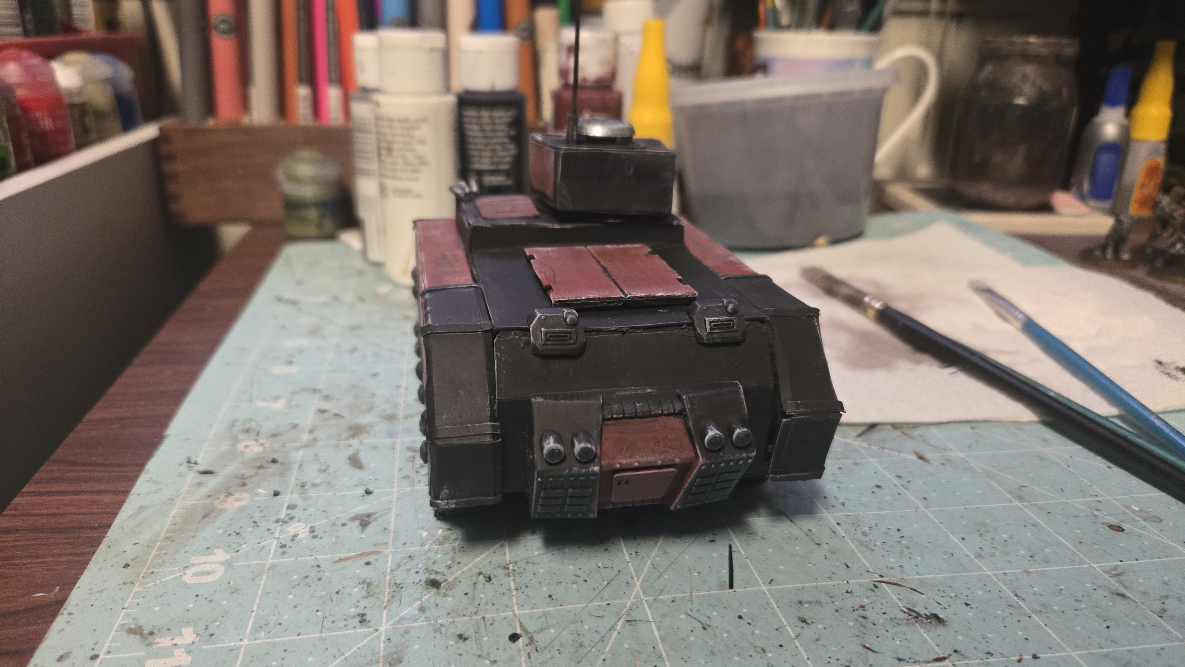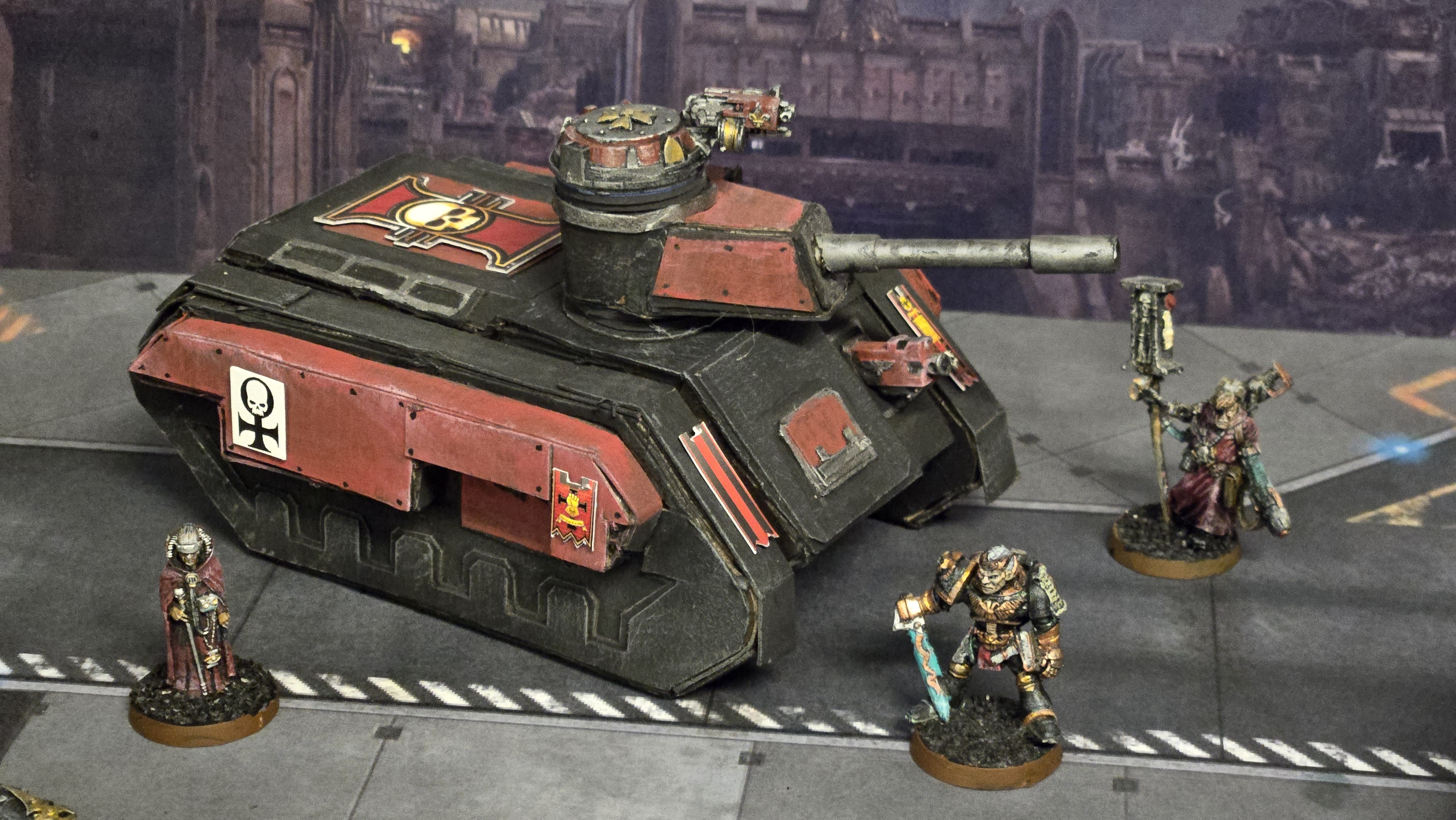 I love the Inquisition in Warhammer 40k. I have several warbands of them in my collection. As they ally with my many armies, I need specialized transports for them. I already showed you my paperhammer rhino, so here is my paperhammer Chimera. (rhino shown for scale & upgrades I did on it)