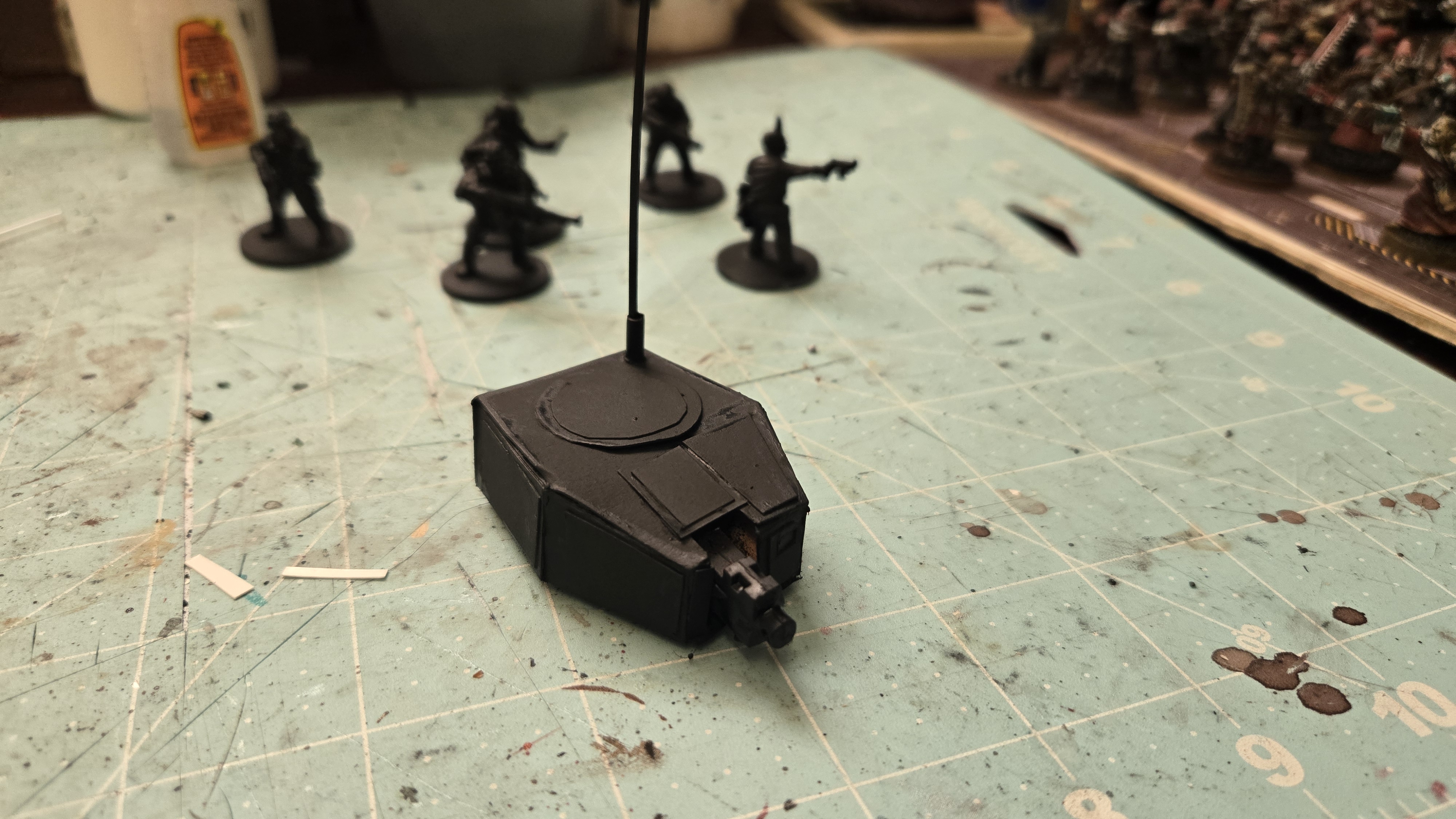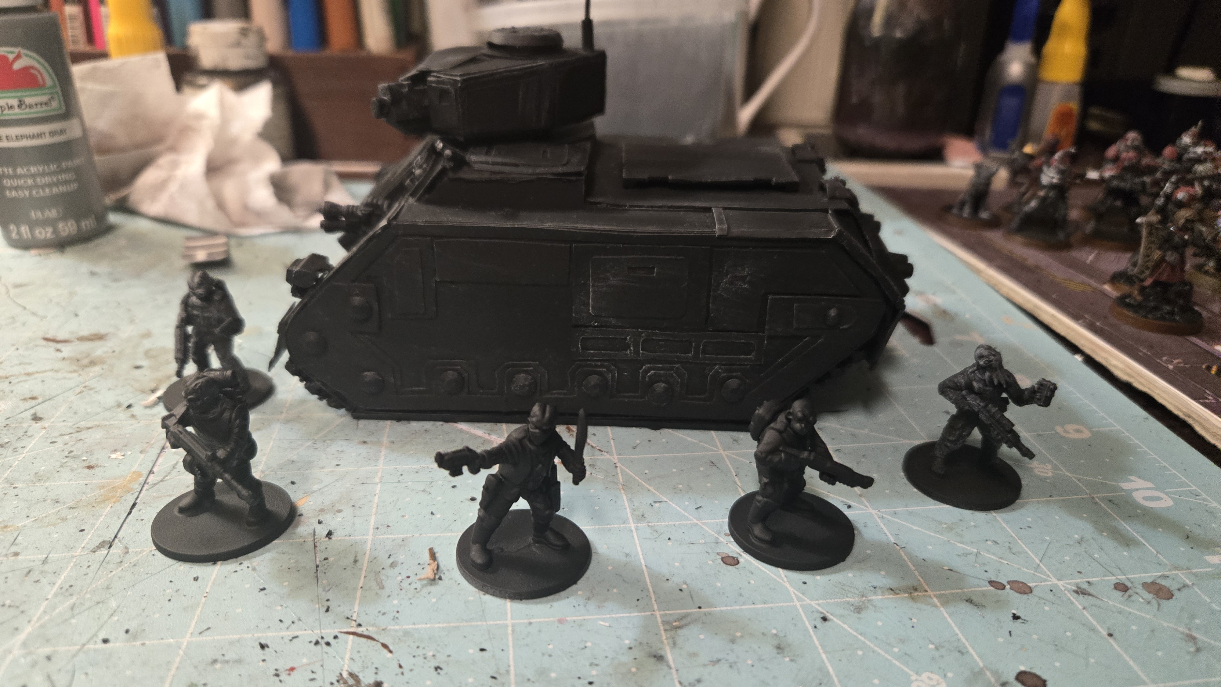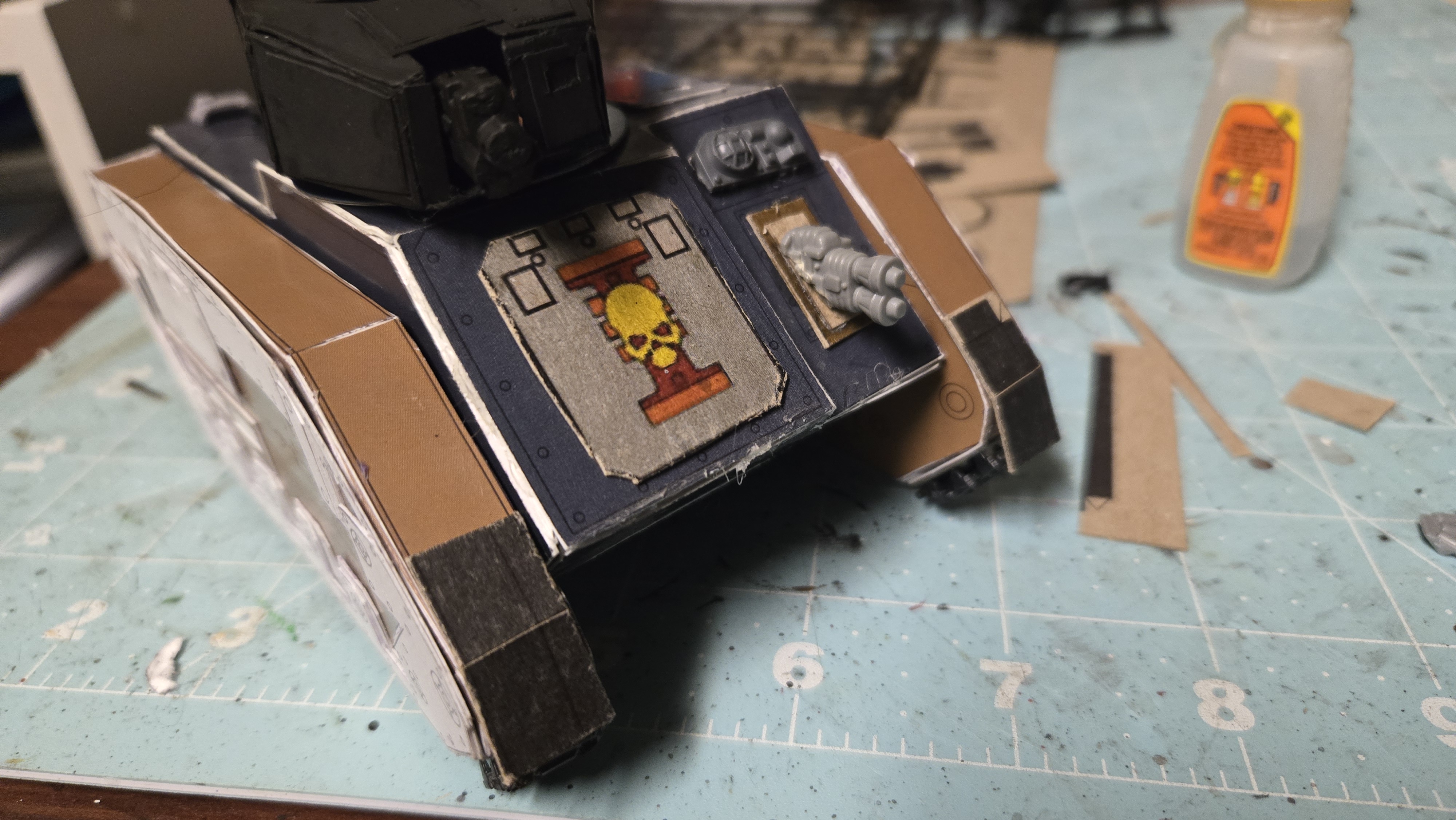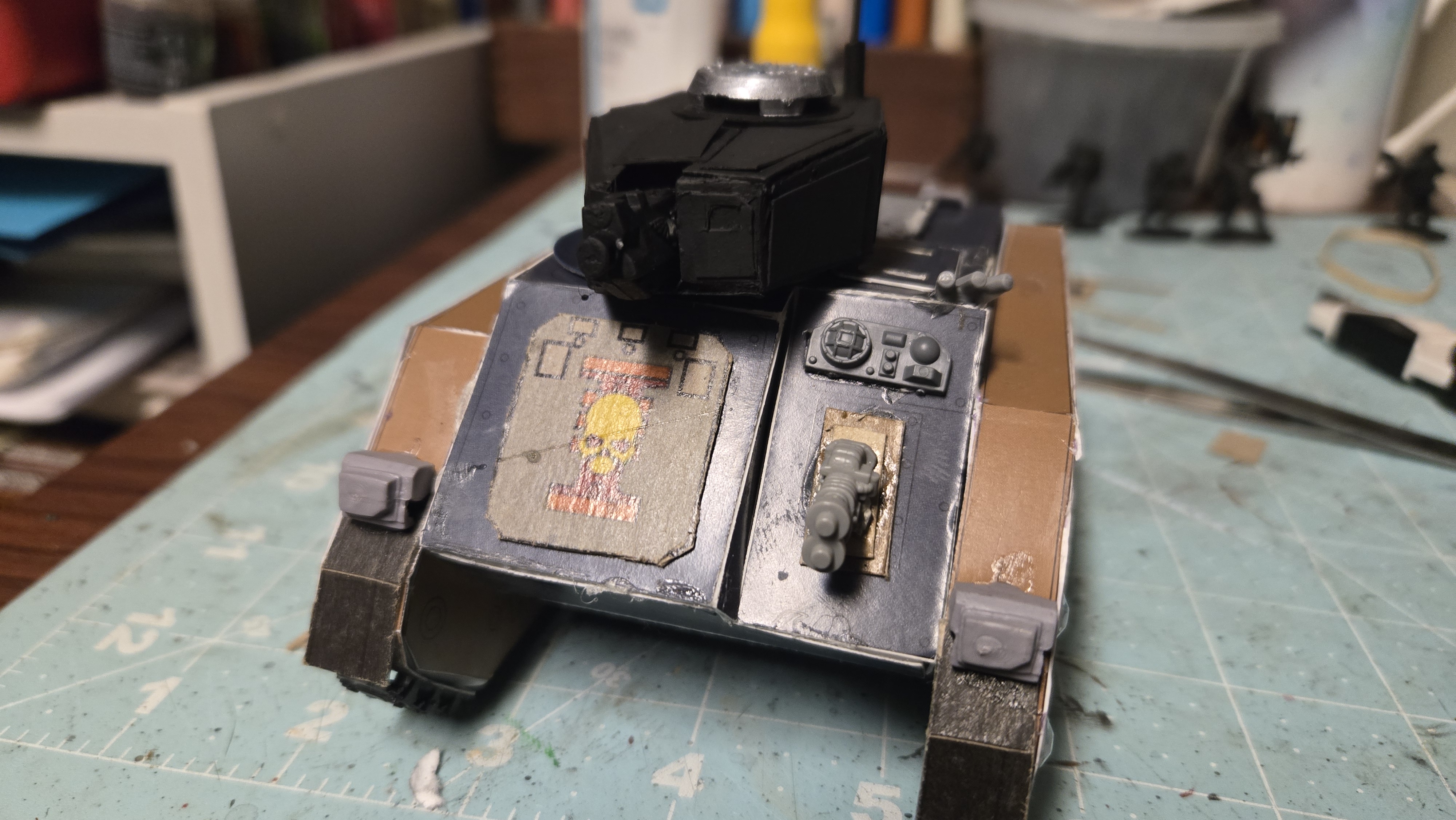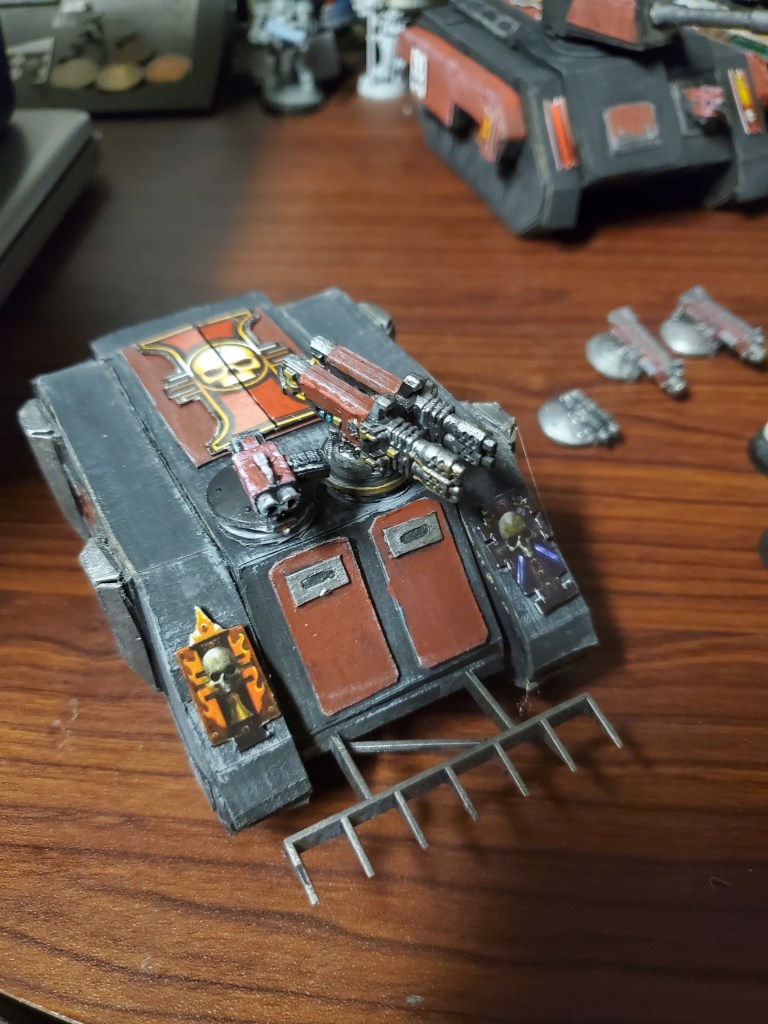 I have some weapons rigs worked up that I can swap out. Keeping weapons choices similar to chimera, the characteristics and stats are virtually the same rules wise in 8th edition. My core of Imperial Guards is RT era figures, and they ride in rhinos back then, so it fits!