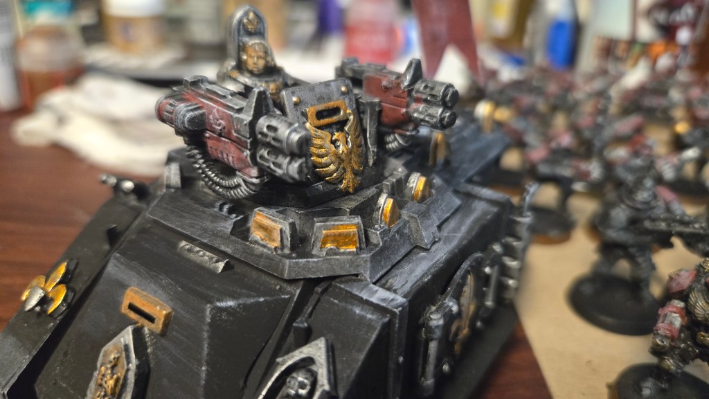 I have some weapons rigs worked up that I can swap out. Keeping weapons choices similar to chimera, the characteristics and stats are virtually the same rules wise in 8th edition. My core of Imperial Guards is RT era figures, and they ride in rhinos back then, so it fits!