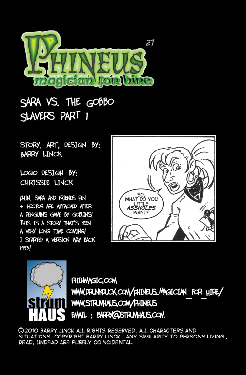 Phineus : Magician for Hire is the brainchild of creator Barry Linck. Phineus was created in 1987, of then a high school senior after reading too much of Matt Wagner's "Mage", too much Dungeon's and Dragon's and watching too much of John Carpenter's "Big trouble in LittleChina". Over the interviening years Phineus changed from angellic savior, to reluctant hero, to art student who finds he is a mage, until, in 1991, for a comic class at Edinboro University, he became part of a Husband and Wife paranormal investigations team, with Phineus' sidekick and wife Sara. Barry produced and self published from 1993 to the present 33 comics with our erstwhile heroes, garnering a small but rabid fan following. View all posts by phinmagic