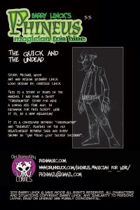 Phineus : Magician for Hire is the brainchild of creator Barry Linck. Phineus was created in 1987, of then a high school senior after reading too much of Matt Wagner's "Mage", too much Dungeon's and Dragon's and watching too much of John Carpenter's "Big trouble in LittleChina". Over the interviening years Phineus changed from angellic savior, to reluctant hero, to art student who finds he is a mage, until, in 1991, for a comic class at Edinboro University, he became part of a Husband and Wife paranormal investigations team, with Phineus' sidekick and wife Sara. Barry produced and self published from 1993 to the present 33 comics with our erstwhile heroes, garnering a small but rabid fan following. View all posts by phinmagic