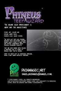 Phineus : Magician for Hire is the brainchild of creator Barry Linck. Phineus was created in 1987, of then a high school senior after reading too much of Matt Wagner's "Mage", too much Dungeon's and Dragon's and watching too much of John Carpenter's "Big trouble in LittleChina". Over the interviening years Phineus changed from angellic savior, to reluctant hero, to art student who finds he is a mage, until, in 1991, for a comic class at Edinboro University, he became part of a Husband and Wife paranormal investigations team, with Phineus' sidekick and wife Sara. Barry produced and self published from 1993 to the present 33 comics with our erstwhile heroes, garnering a small but rabid fan following. View all posts by phinmagic
