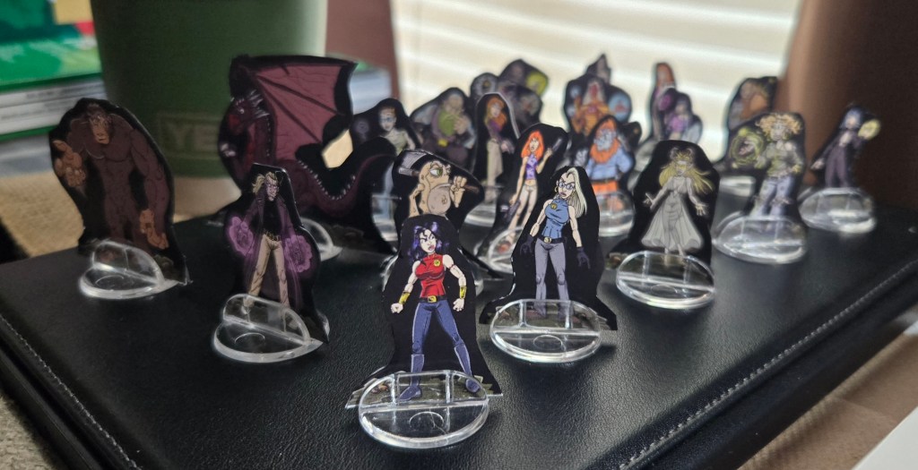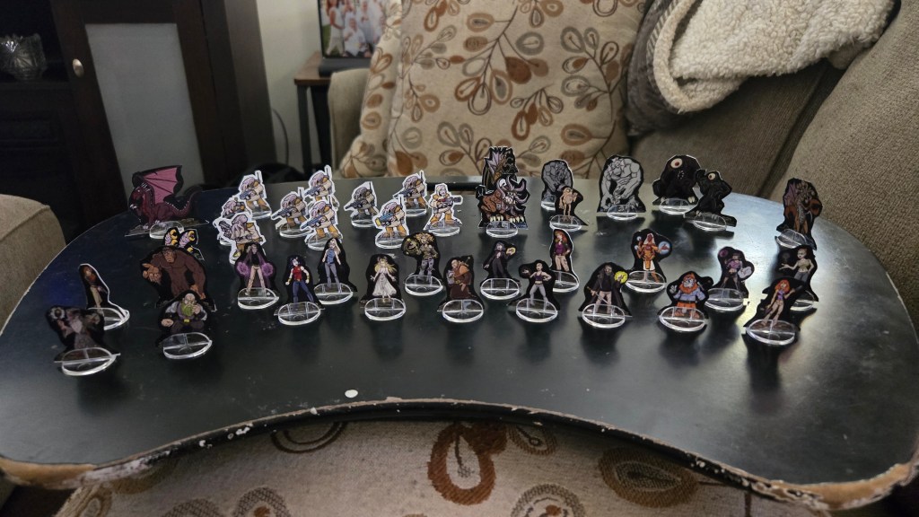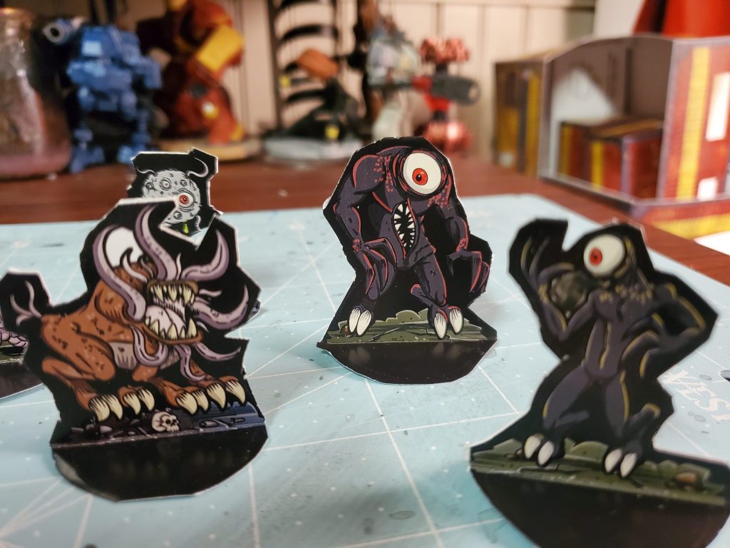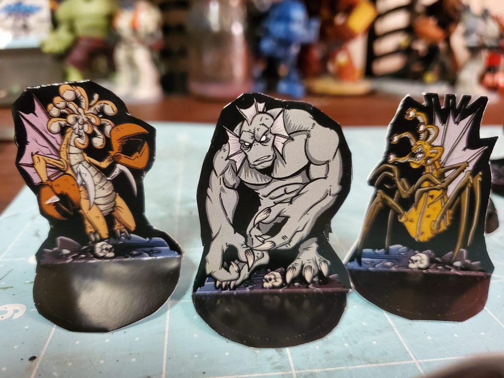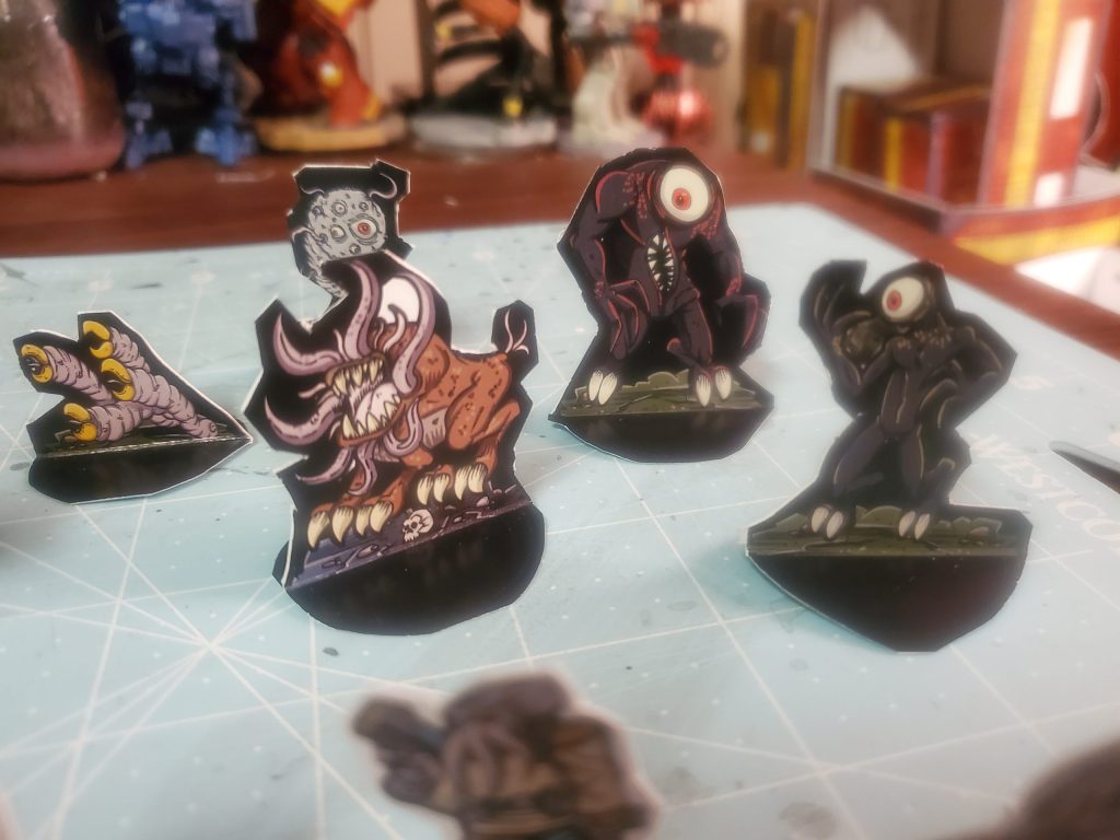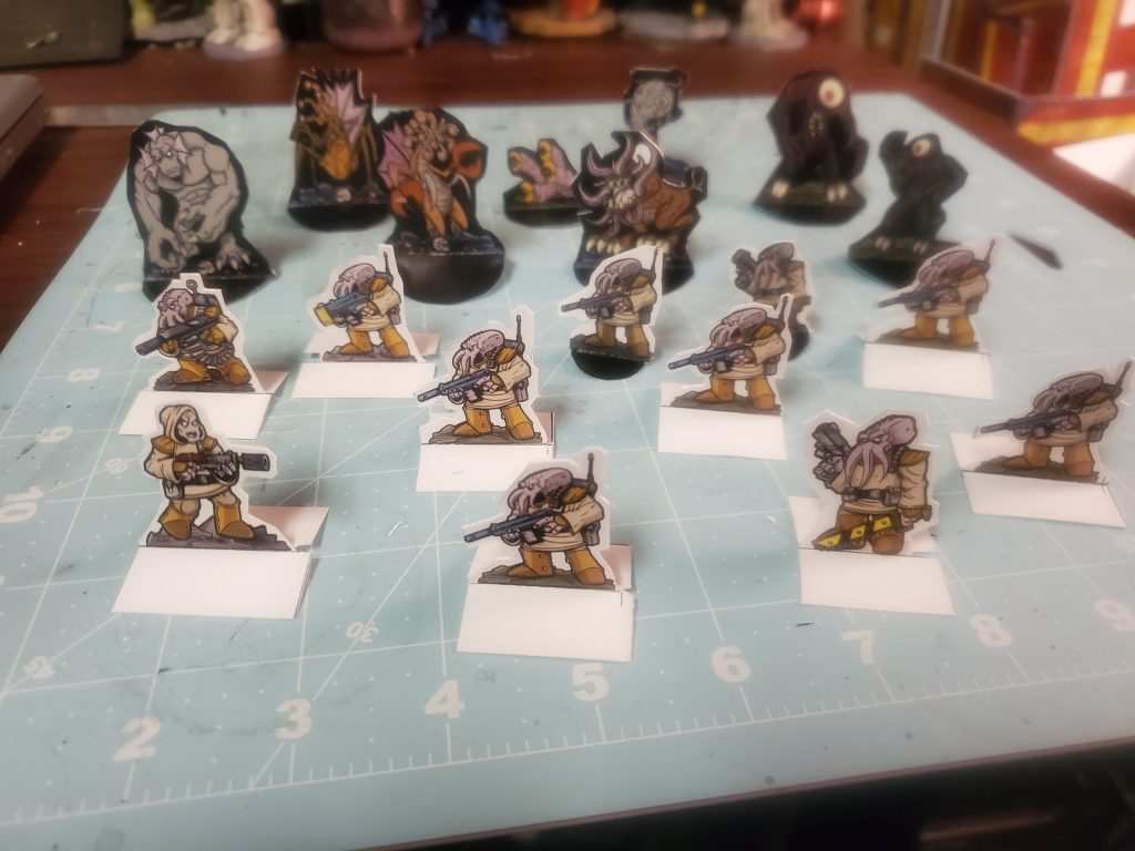 So, here’s a bunch of the token figures for my game. I have a bunch more to cut out, zombies, more monsters and gribblies, but it’s coming along. The player characters, have a bunch of designs to choose from, but the party will be 7.