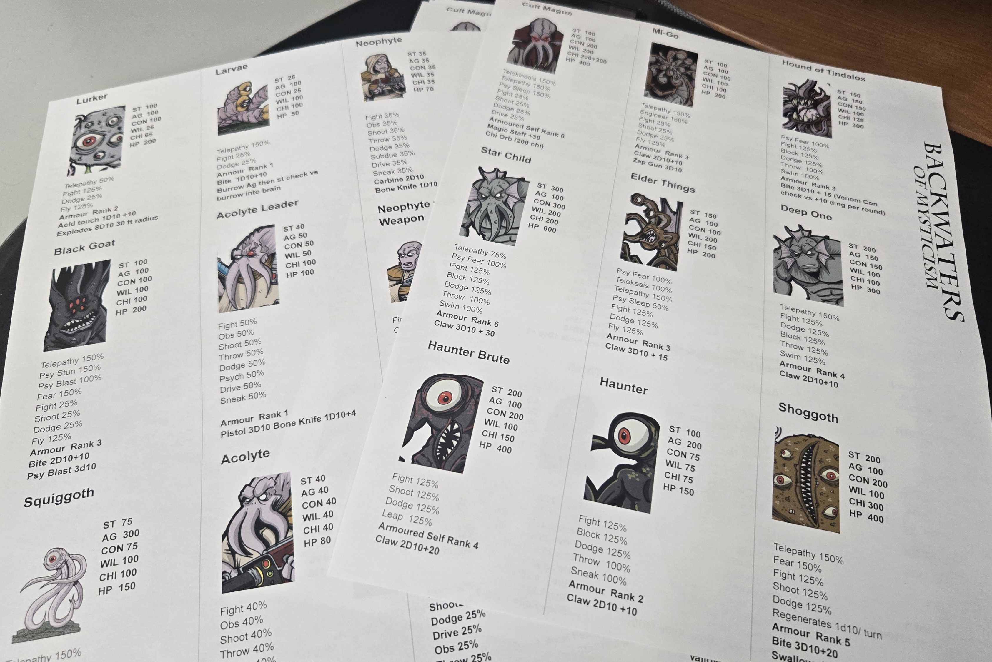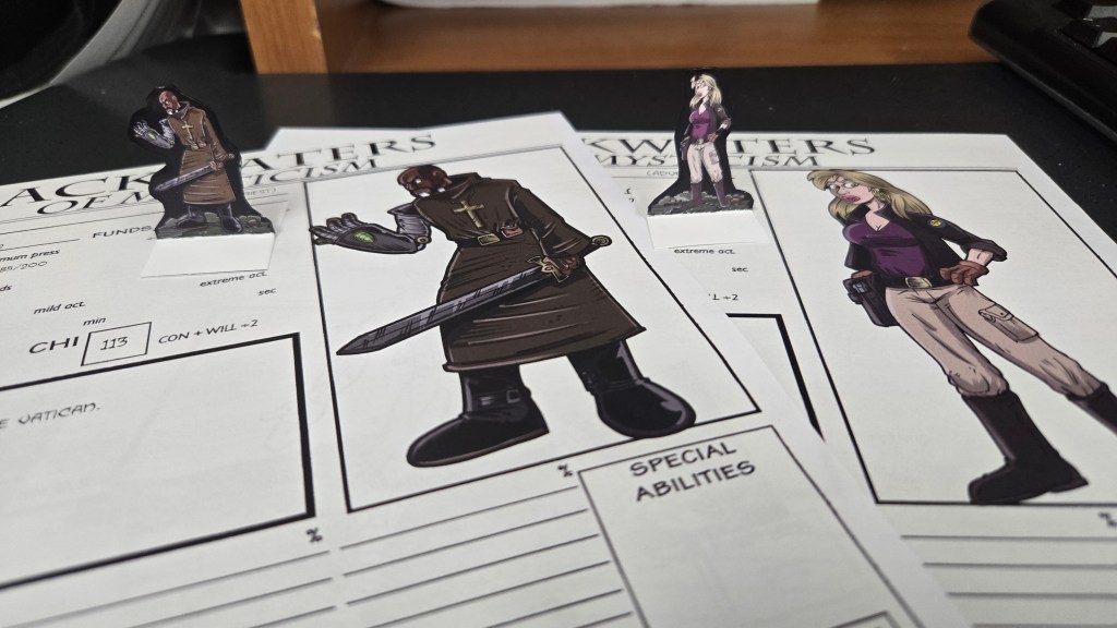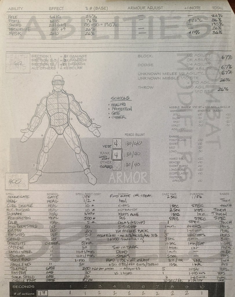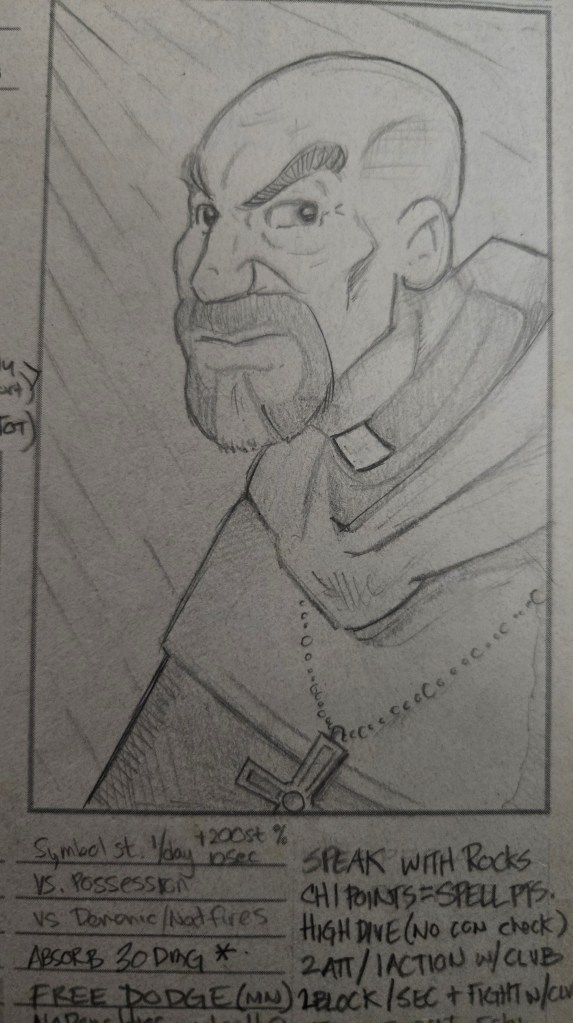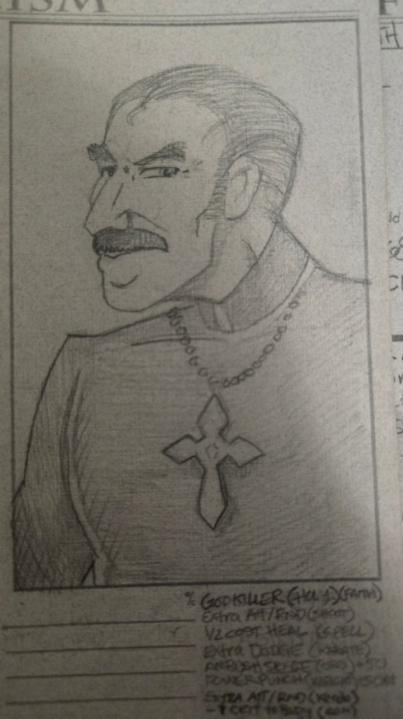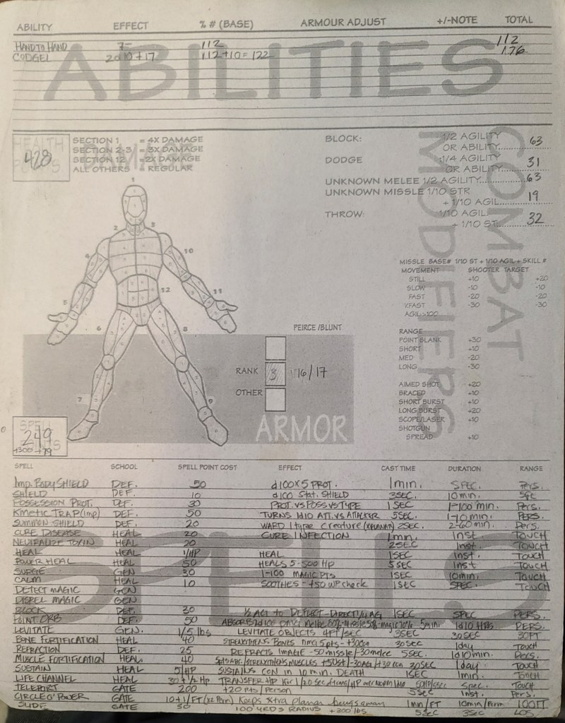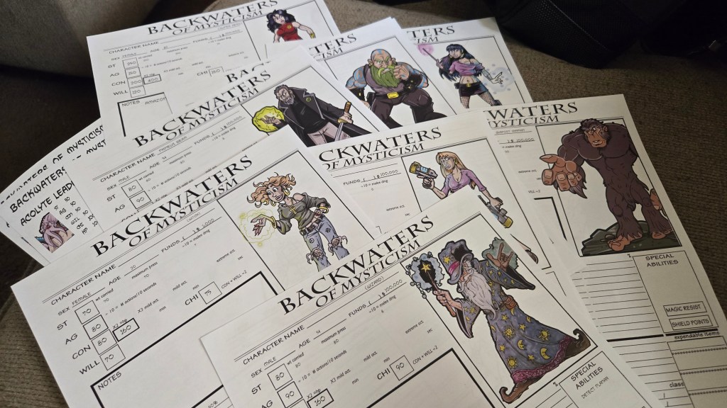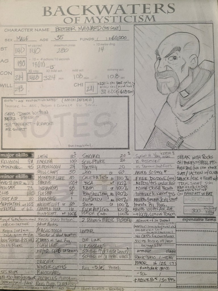 I was going through all my gaming stuff (mostly Backwaters of Mysticism) and I found all my old character sheets. I’ve played a LOT of RPGs. Backwaters became my different groups’ go to system. . We mixed up the worlds with we played in. Some straight up fantasy (Rugnar was my Dwarven Priest if Thor), modern, modern fantasy, some space sci fi, Super heroes, Kung Fu, westerns, etc.