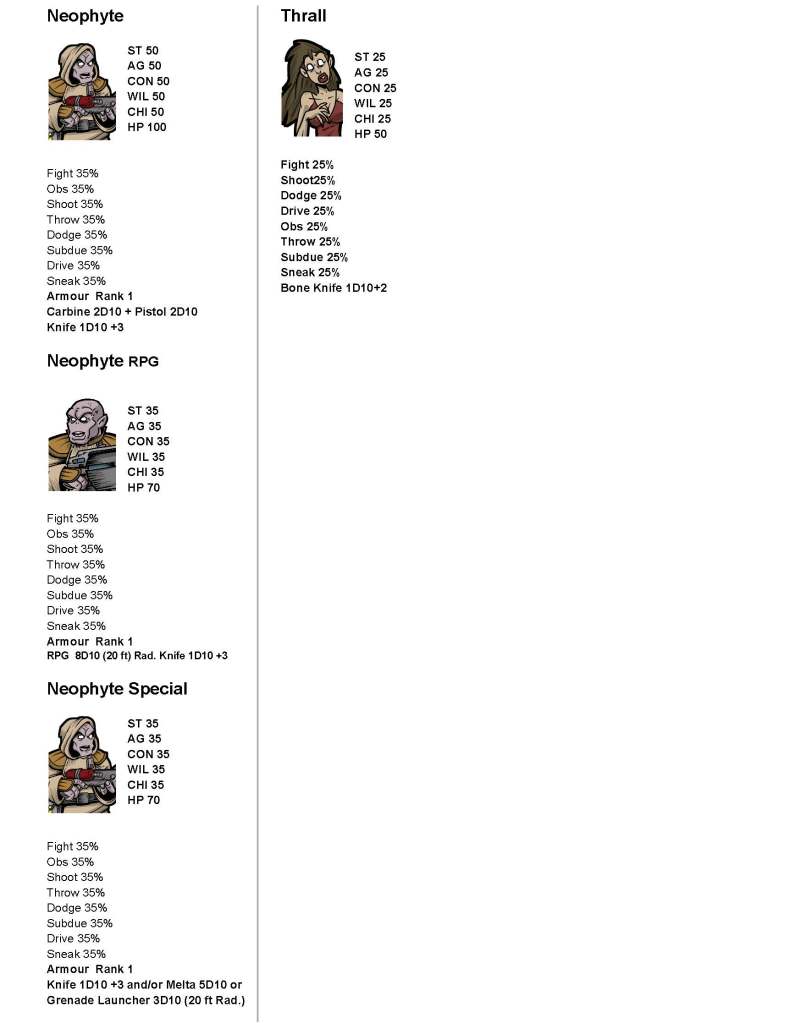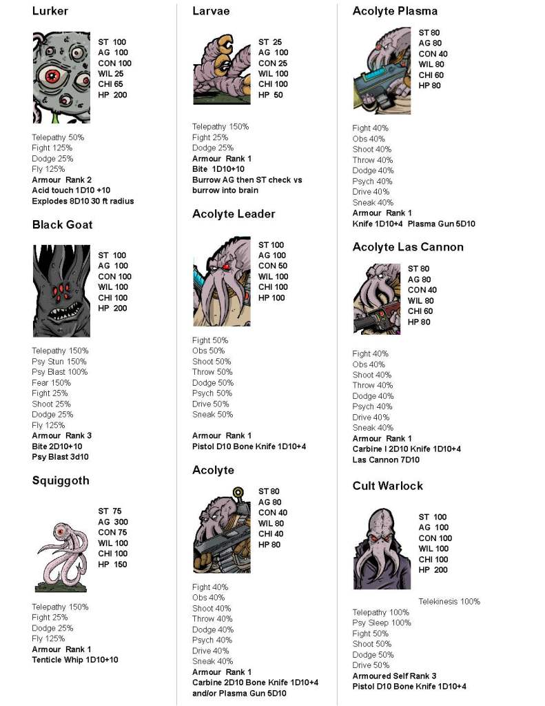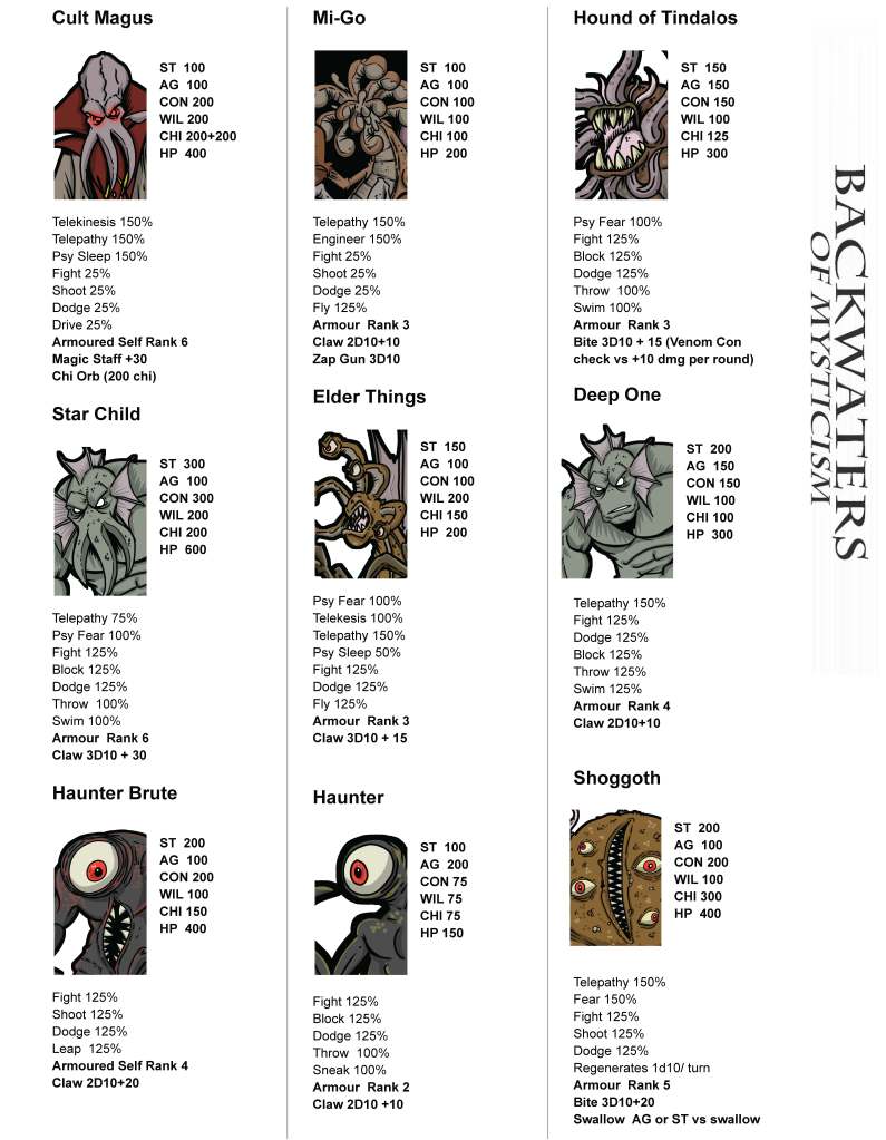 Here’s the baddies for the Module I’m working on. Sorry about the lack of pages this week, I’ve been in game mode. I run the game the first time this weekend. I’m a little nervous!